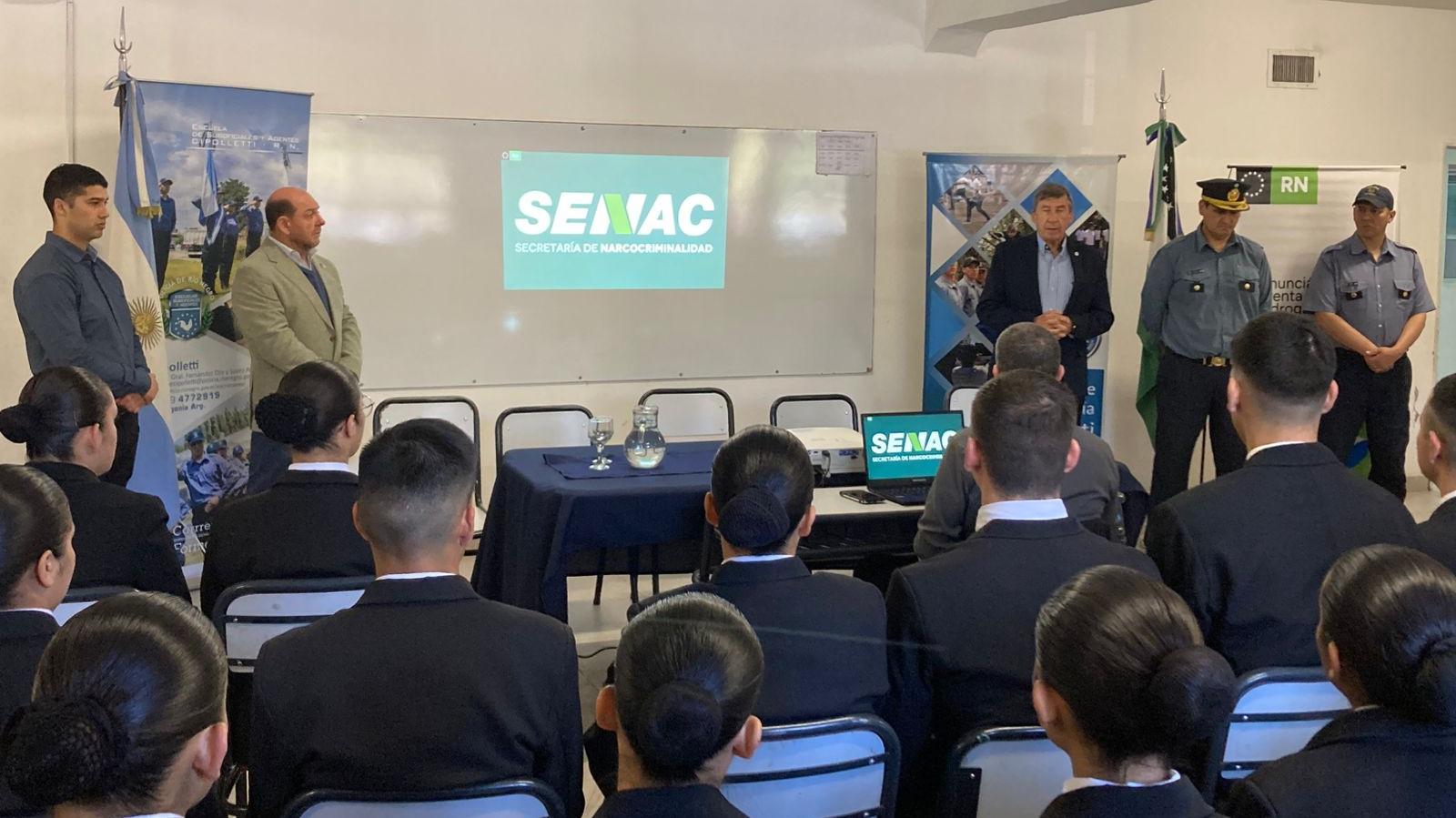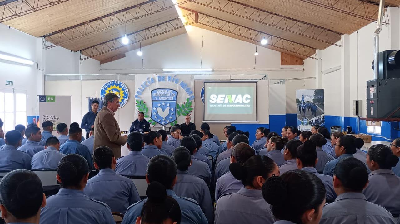 El Ministerio de Seguridad y Justicia de Río Negro, a través de la Secretaría de Narcocriminalidad (SENAC), llevó su ciclo de charlas a los aspirantes de la Escuela de Suboficiales y Agentes de la Policía de Río Negro en Cipolletti. La jornada fue parte de una iniciativa que comenzó la semana pasada en la Escuela de Cadetes de Viedma.